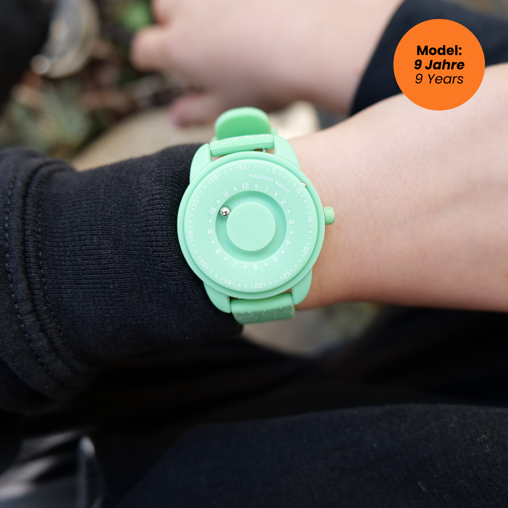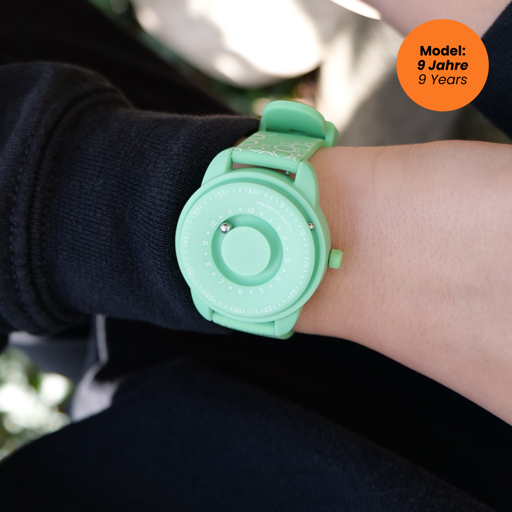 Bubbles Green von Magneto Watch bringt eine frische Farbnote an jedes Kinderhandgelenk. Zwei Magnetkugeln – eine größere Innenkugel für die Stunden und eine kleinere Außenkugel für die Minuten – sorgen für ein außergewöhnliches Zeitablesen, das neugierige Blicke auf sich zieht. Das robuste Kunststoffgehäuse (ABS) ist angenehm leicht, während das grüne Silikonarmband mit blasenartigem Print an Seifenblasen erinnert. So wird das Erlernen der Uhrzeit zu einem fröhlichen Erlebnis – und Kinder haben immer einen coolen Hingucker am Handgelenk.