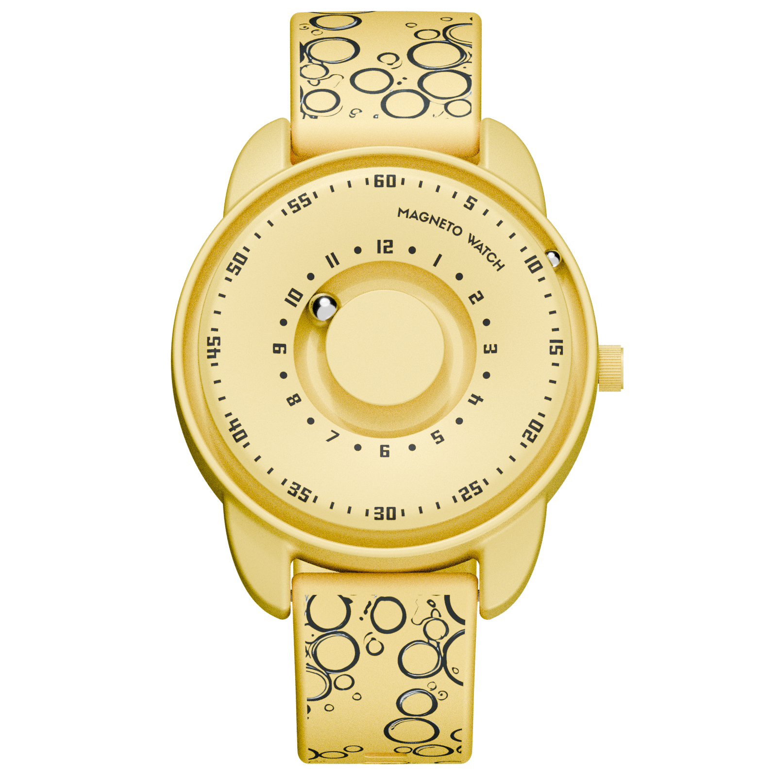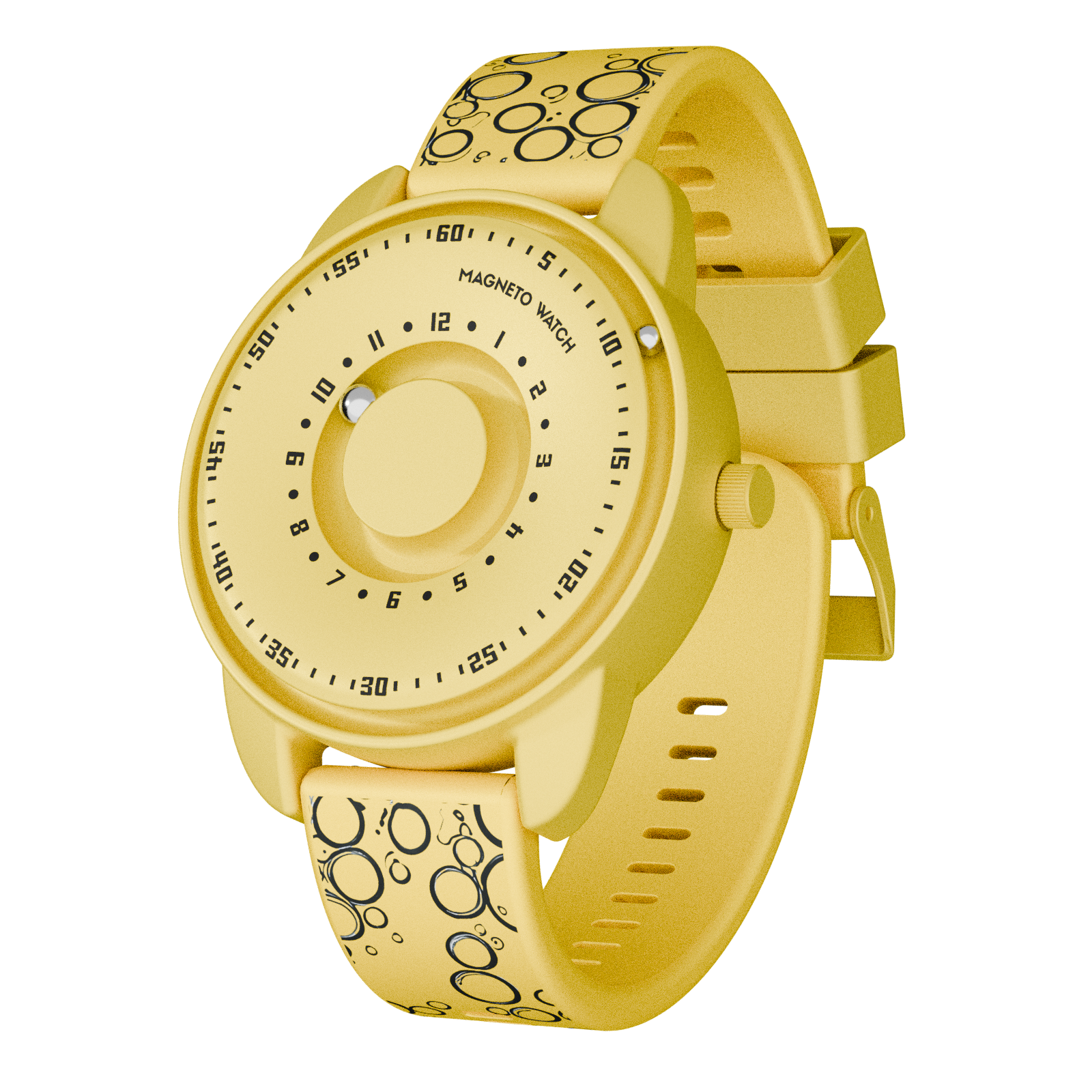 Bubbles Yellow von Magneto Watch bringt sonnige Stimmung an jedes Kinderhandgelenk. Zwei Magnetkugeln – eine größere Innenkugel für die Stunden und eine kleinere Außenkugel für die Minuten – sorgen für ein außergewöhnliches Zeitablesen, das neugierige Blicke auf sich zieht. Das robuste Kunststoffgehäuse (ABS) ist angenehm leicht, während das gelbe Silikonarmband mit blasenartigem Print an Seifenblasen erinnert. So wird das Erlernen der Uhrzeit zu einem fröhlichen Erlebnis – und Kinder haben immer einen coolen Hingucker am Handgelenk.