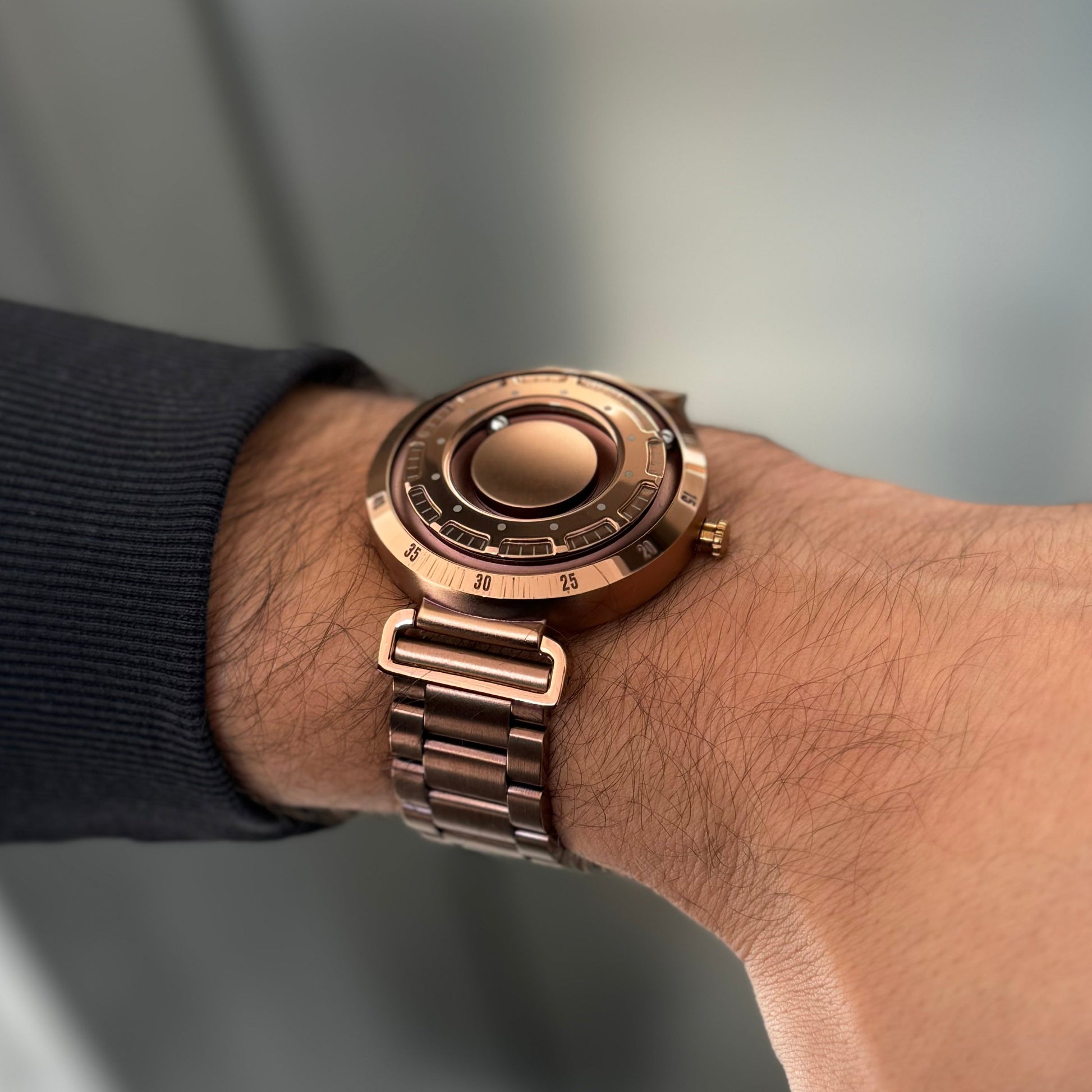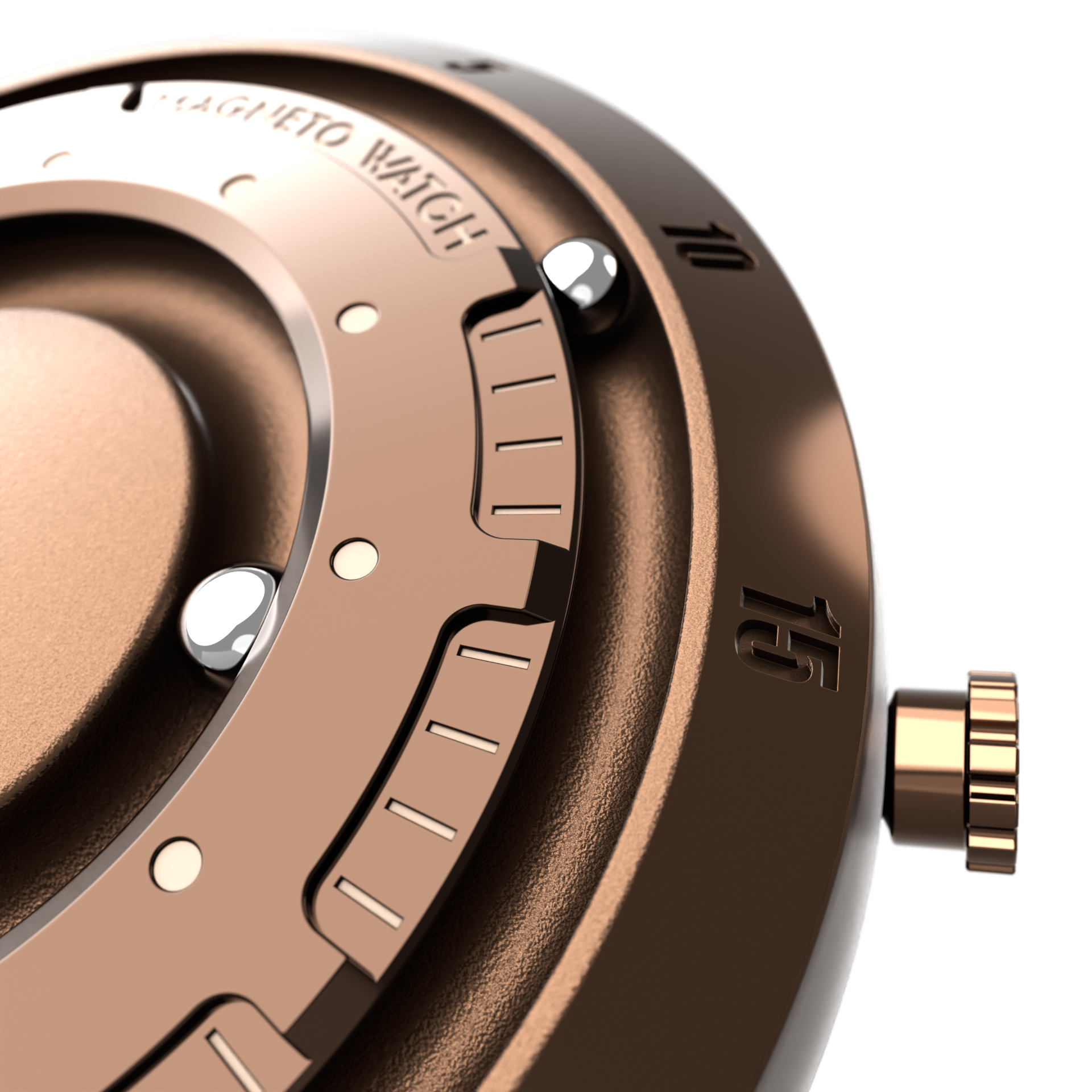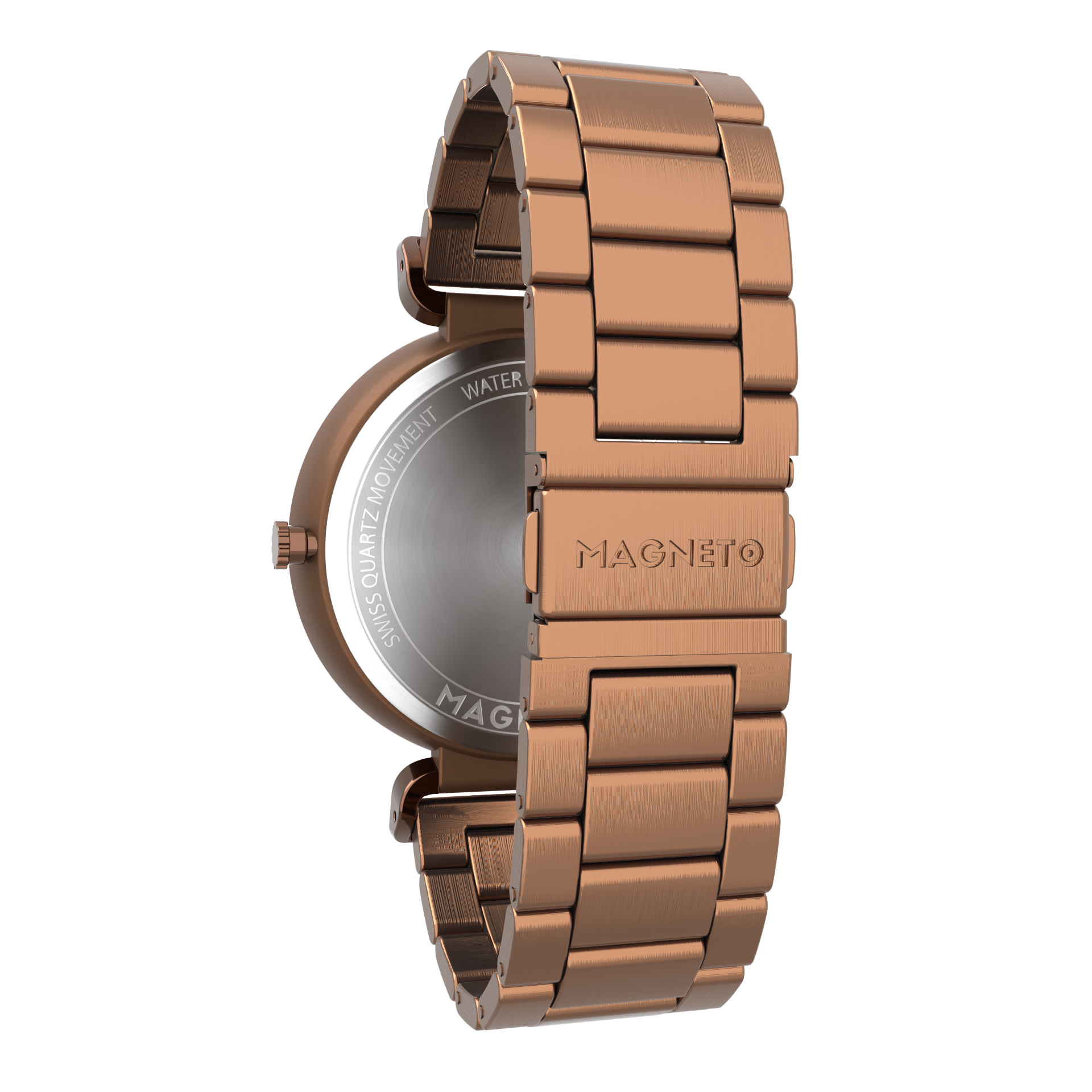 Die Magneto Nexus Coffee vereint modernes Design mit minimalistischer Raffinesse. Ihr teilweise glänzendes Gehäuse aus hochwertiger Alloy und die innovative Magnetzeiger-Technik machen diese Uhr zu einem echten Blickfang. Zwei schwebende Kugeln ersetzen klassische Zeiger und verleihen der Uhr einen futuristischen Touch. Das Coffee farbene Edelstahlarmband mit Gliedern und Faltschließe bietet Komfort und Stil in Perfektion. Gehäusedurchmesser: 43 mm, Gehäusehöhe: 12 mm. Die perfekte Wahl für alle, die Eleganz und Innovation lieben und ein Statement setzen möchten.