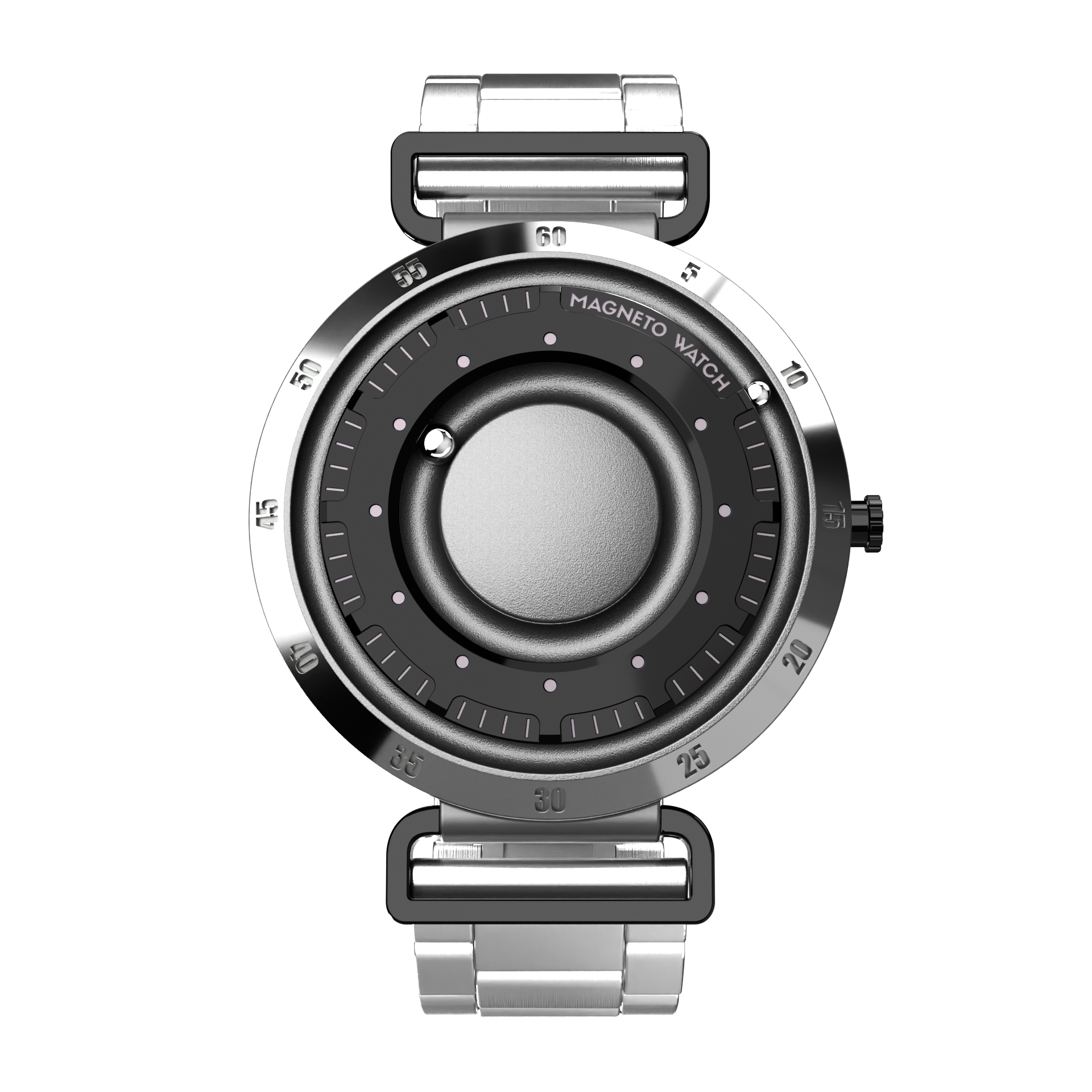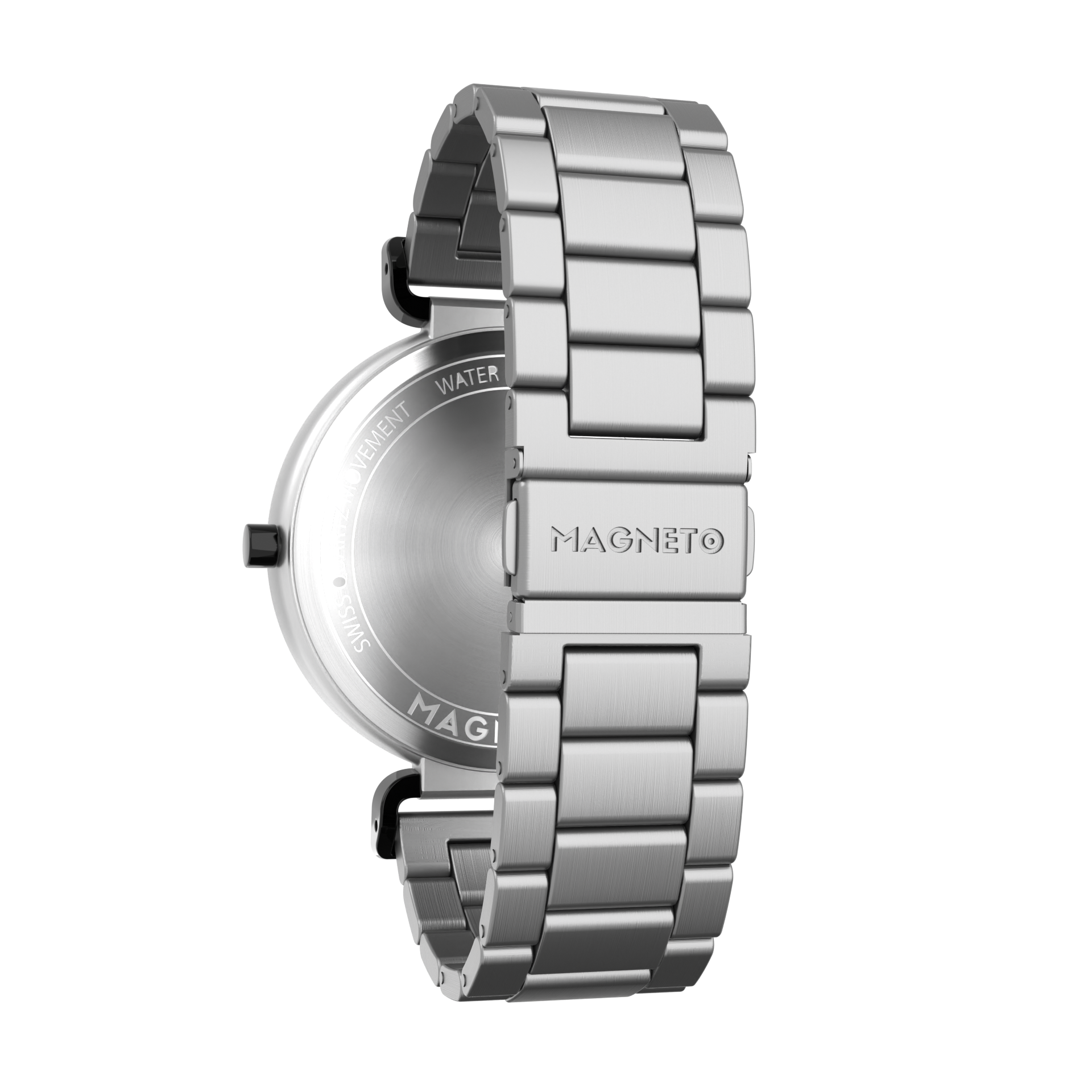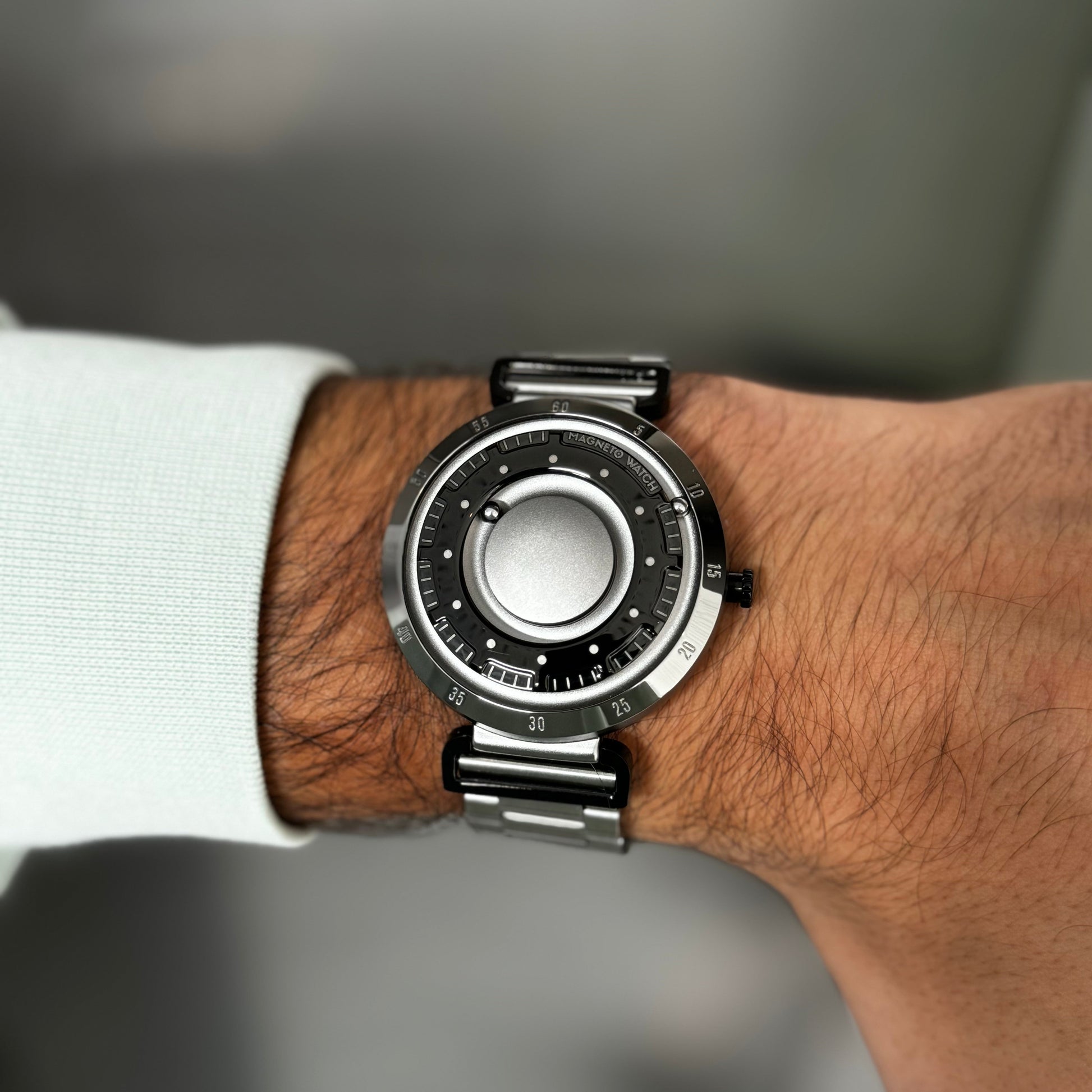 Die Magneto Nexus Titan vereint modernes Design mit minimalistischer Raffinesse. Ihr teilweise glänzendes Gehäuse aus hochwertiger Alloy und die innovative Magnetzeiger-Technik machen diese Uhr zu einem echten Blickfang. Zwei schwebende Kugeln ersetzen klassische Zeiger und verleihen der Uhr einen futuristischen Touch. Das silberfarbene Glieder-Edelstahlarmband und Faltschließe bietet Komfort und Stil in Perfektion. Gehäusedurchmesser: 43 mm, Gehäusehöhe: 12 mm. Die perfekte Wahl für alle, die Eleganz und Innovation lieben und ein Statement setzen möchten.
